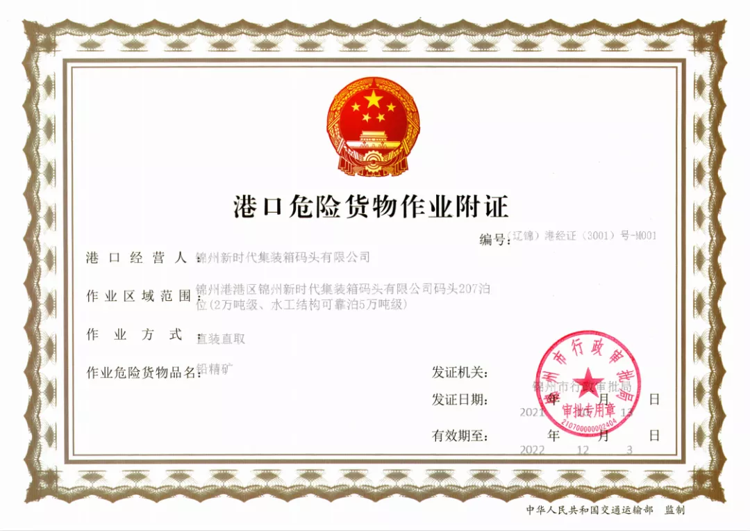 ? ? ? ?10月13日,我司正式獲取《港口危險(xiǎn)貨物作業(yè)附證(鉛精礦)》證書。這為外貿(mào)航線在錦州港進(jìn)一步集聚,維護(hù)港口供應(yīng)鏈穩(wěn)定提供了重要硬件支持。